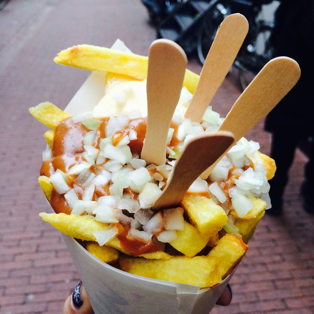 Before we get into the best place to get them, there are several things you need to know about proper Vlaamse Frites. Firstly they come served in a paper cone, usually outrageously hot, with a little fork which you’ll find a help when you get closer to the bottom and the sauce is starting to flood the last few crispy bits. Sauce-wise purists will tell you its mayonnaise all the way. Dutch mayo is creamer, sweeter and thinner than Helmans and definitely worth a taste. It’s often simply referred to as Fritesaus whilst Mayonnaise is slightly thicker. But be sure to explore the full list – saté sauce is authentically Dutch due to the country’s Indonesian heritage whilst those who hark back to childhood memories of stirring ketchup and mayonnaise together will be satisfied with Cocktail or Whiskey sauce. If however you want to go for the full experience ask for Oorlog (meaning war) which is a combination of saté, mayo and onions and just as messy as it sounds.