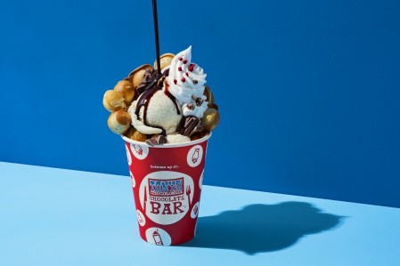 Open for breakfast, lunch and dinner (or that magic hour when your chocolate is being made downstairs) the bar is a highly stylised; grab-a-seat kind of place serving all the crazy chocolate-inspired food and drink you can imagine as well as some savoury dishes and some frankly bizarre mash-ups (croquettes served with dark chocolate or white chocolate quinoa burger anyone??) But let’s face it, what you’re really here for are the freakshakes, bubble waffles, hot choc, s’mores, pretzel toppings, cake and wait for it…. free flowing chocolate taps.